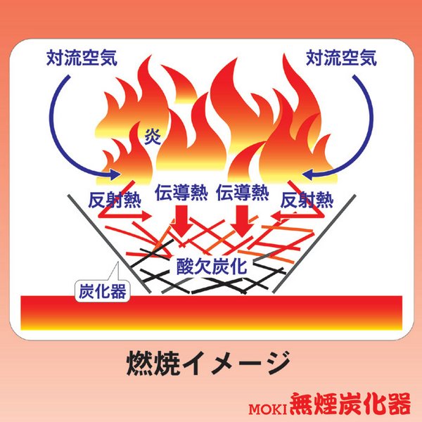 燃焼効率がとてもよく、約900℃の高温になり植物が半生状態でも煙を出すことなく短時間で炭を作ることができます。