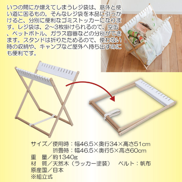 ●畳んでキャンプなど、アウトドアでも使えそう! いつの間にか増えてしまうレジ袋は、意外と使い道に困るもの。そんなレジ袋を本品に引っかけると、分別に便利なゴミストッカーになります。レジ袋は、2〜3枚掛けられるので、空缶、ペットボトル、ガラス容器などの分別ができます。スタンドは折りたためるので、使わない時の収納や、キャンプなど屋外へ持ち出すのにも便利です。