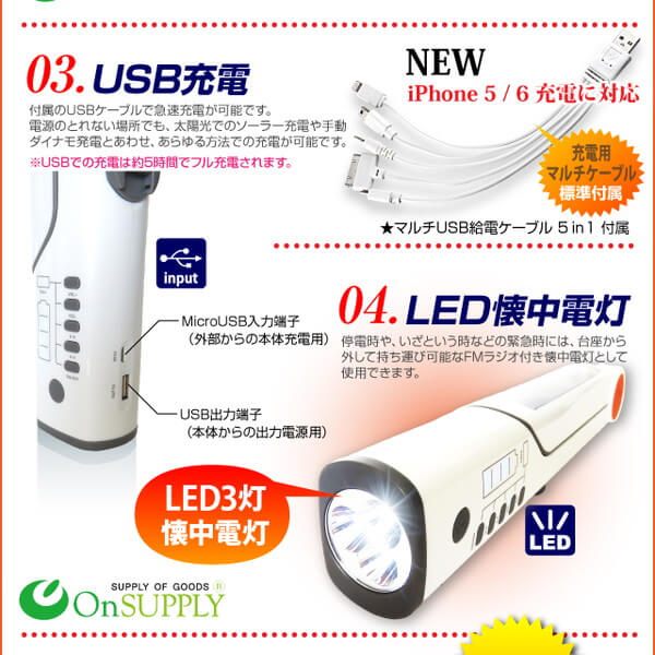 (ソーラー充電/手回し充電/USBバスパワー充電)