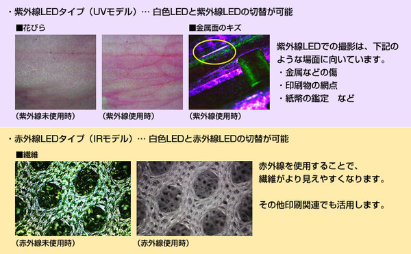 どちらのタイプも白色LEDによる撮影(通常撮影)が可能なため、1台で2通りの使い方ができます。