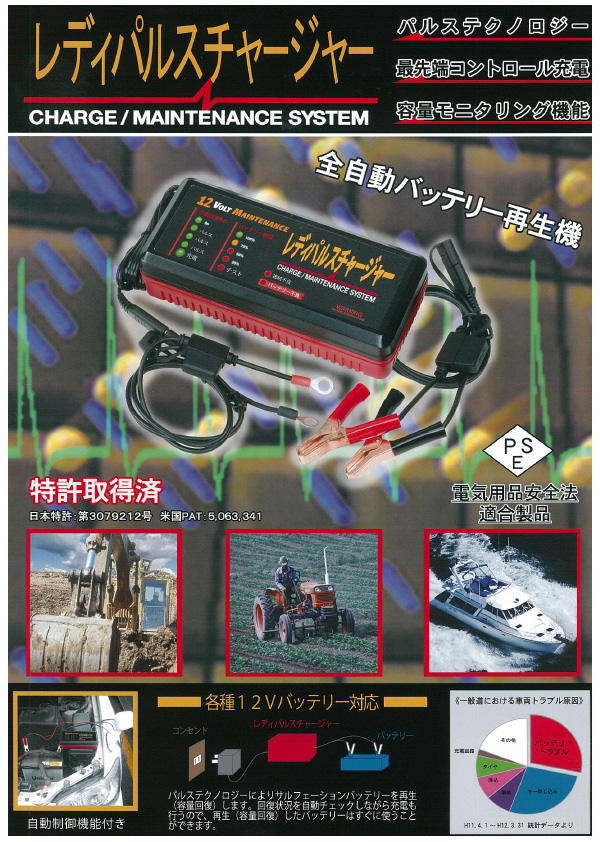 レディパルスチャージャーはバッテリー内に特許取得済みの高周波パルスを送ることで、バッテリー劣化の原因となるサルフェーション(硫酸鉛の結晶化)の蓄積を除去または防止し、バッテリー機能を回復させる再生機です。回復状況を自動チェックしながら充電も行うので、再生したバッテリーはすぐに使用することが出来ます。